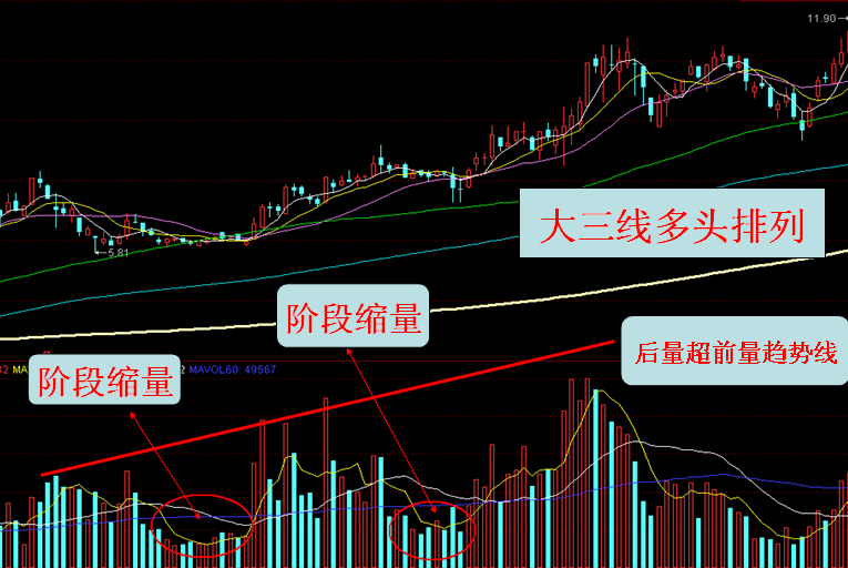 ①,股价大级别上升趋势途中,大三线多头排列向右上方运行,成交量出现阶段缩量配合股价短期回调之后,成交量再次放量推动股价上涨,演变为后量超前量走势,同时股价一路震荡走高。