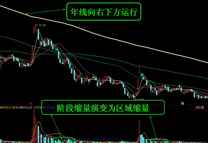 ②,股价大级别下降趋势途中,年线向右下方运行,成交量出现阶段缩量走势之后,成交量柱在均量线量能退潮,死叉信号的压制下长时间缩量,成交量由阶段缩量演变为区域缩量,股价伴随着成交量柱的萎缩,一路震荡下行。[1]