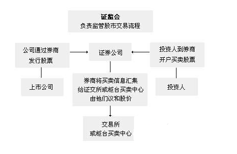 简单说,股市就是股票买卖的交易市场。 股市既然是买卖股票的地方,那么在这市场中有哪几种单位?大家不妨从以下几个问题思考:股票由谁"生产"?股价由谁撮和合?般投资人到哪里去买股票?如果将这几个环节串连起来,我们可以得到以下一个股市交易图。